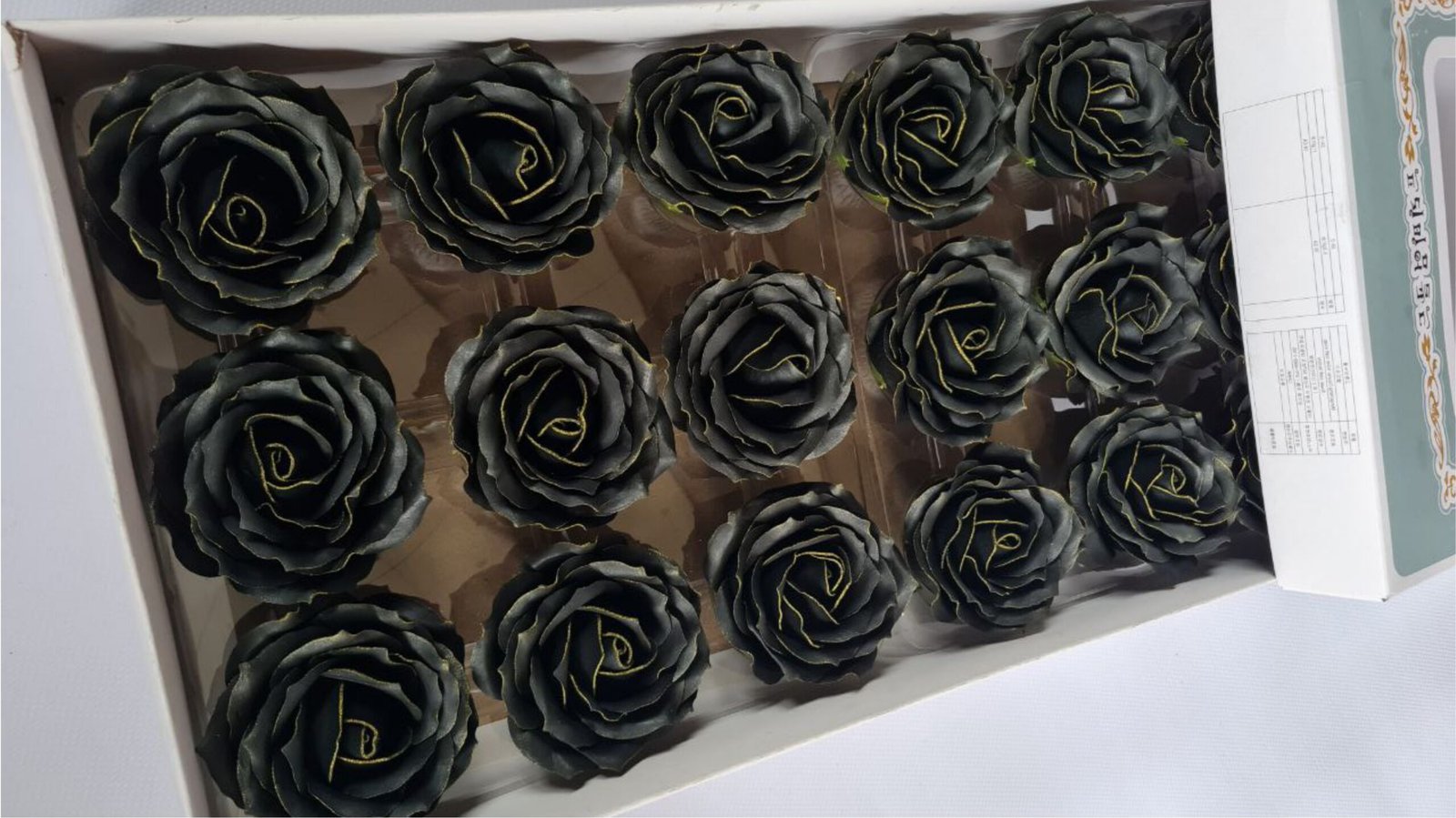 Будьте першим, хто залишив відгук на “Чорна кучерява мильна троянда (великий бутон) з золотим кантом”